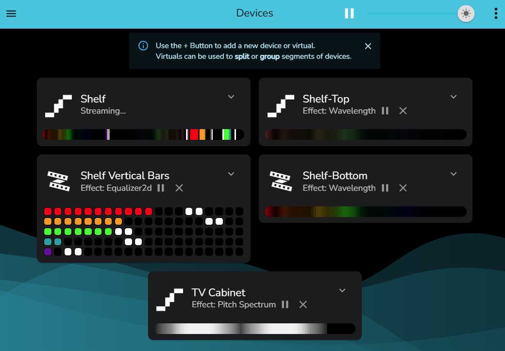 LEDFx is great, it easily drives the ~700 LEDs on the network at 60 fps on my Raspberry Pi 4B. (The WLED chips all use ESP32 controllers and Wi-Fi. In the future I may switch to ethernet to reduce the 2.4GHz bandwidth usage that comes from all that traffic.) Below is pictured the LEDFx dashboard, while audio is playing: