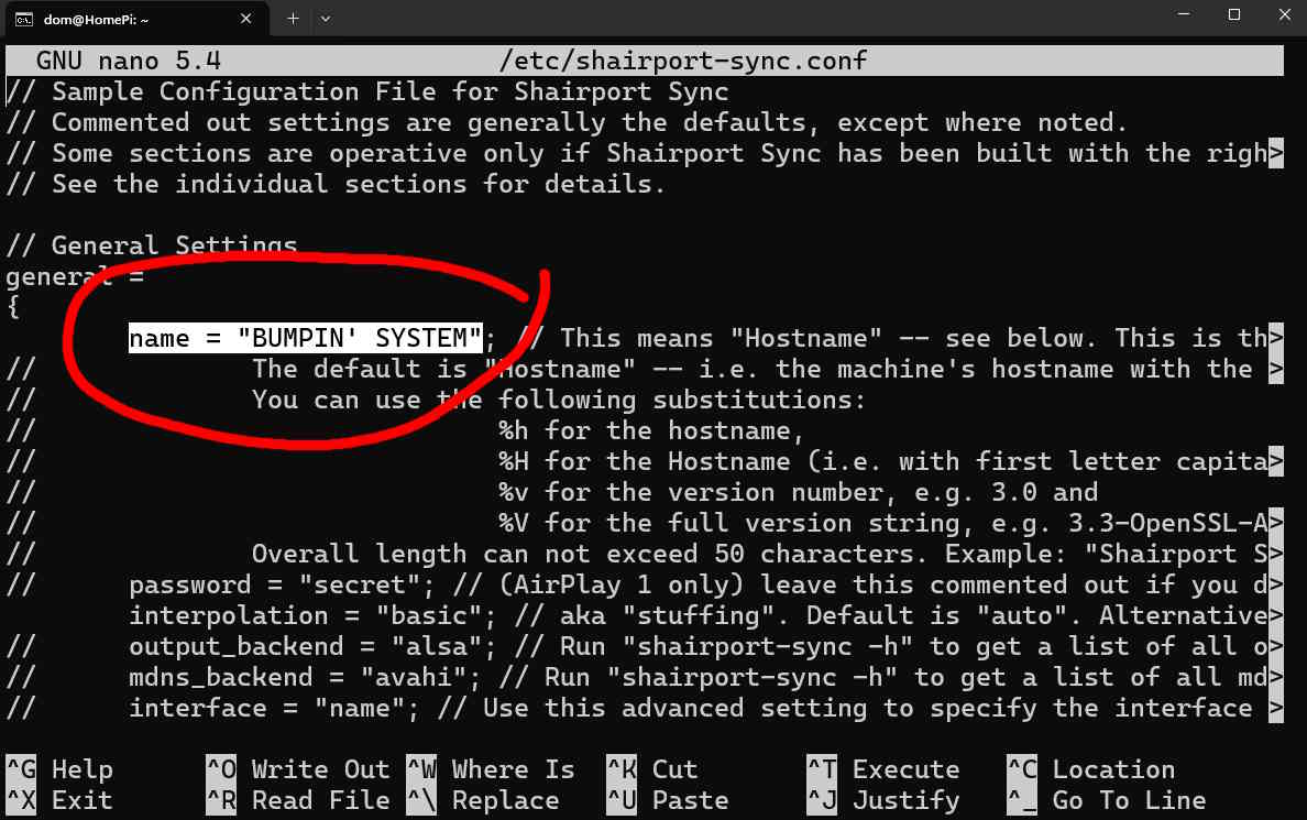 As you can see below, ShairPort-Sync comes with options to give your receiver a custom name as well. Naturally, happy with the new sound system, I fittingly named it "BUMPIN' SYSTEM"