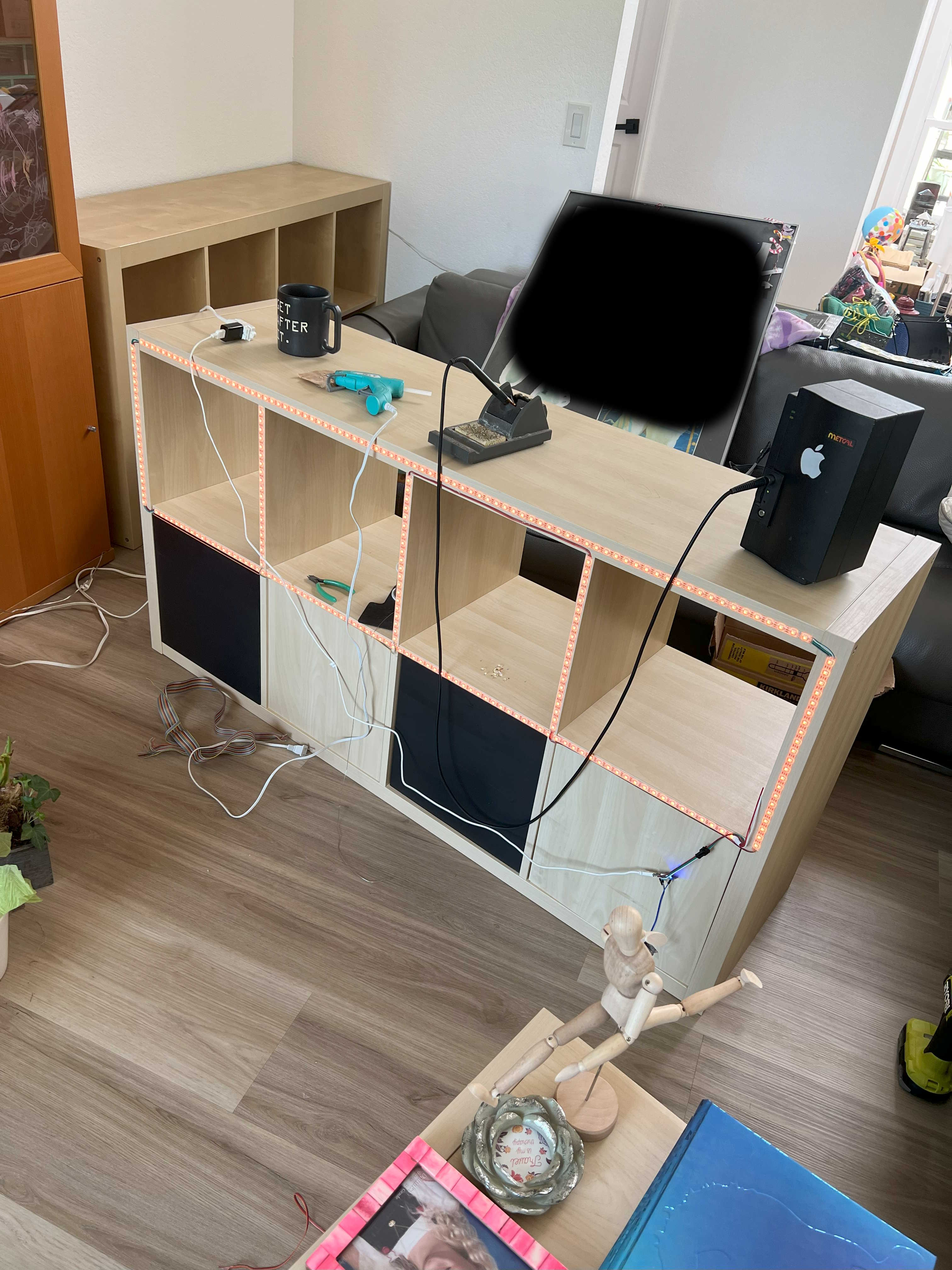 I used my soldering skills to elegantly cut and route LEDs on the back of this IKEA shelf.