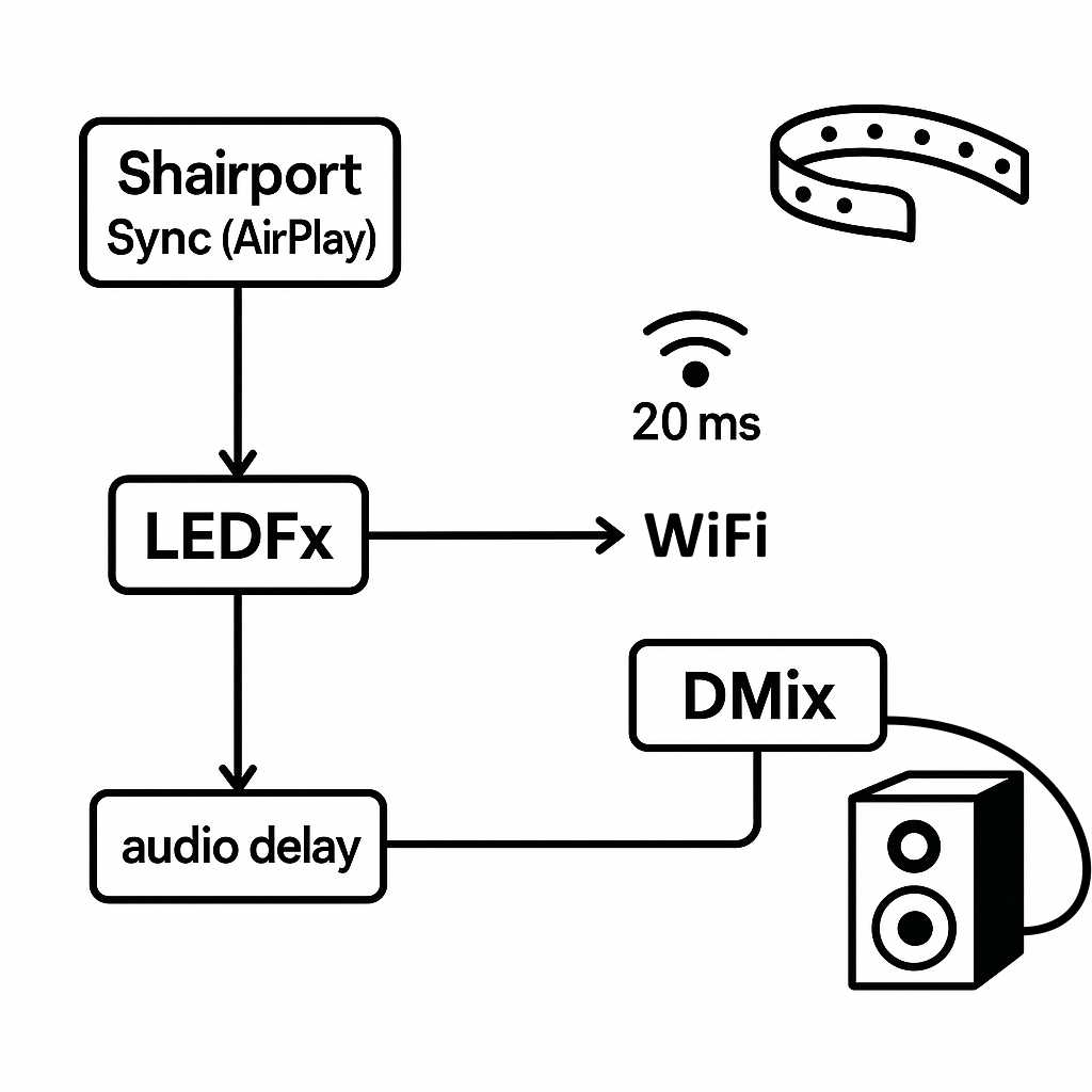 For audio processing and driving the LED effects, I used the Python-based LEDFx library. It handles both processing the audio signal using FFTs, as well as sending UDP packets over the local network to WLED strips on my network.